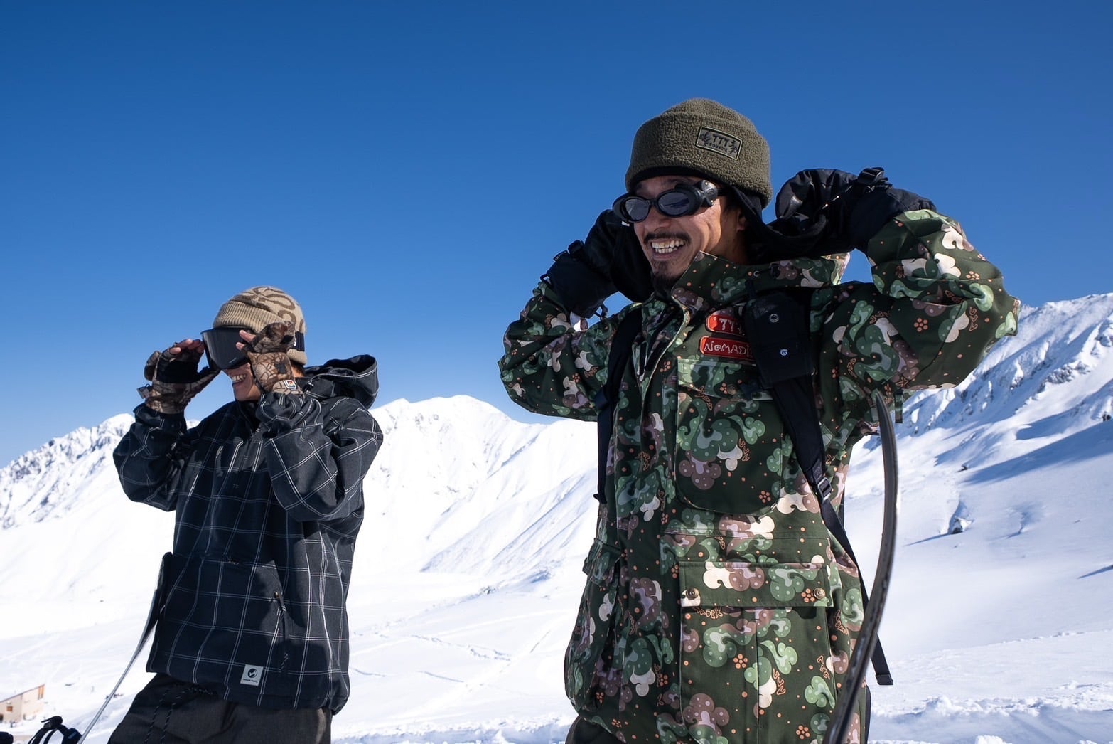 デザインはもちろん、3レイヤーの生地はストレッチが効いてて動きやすくバックカントリーへ行ける機能を持ちながら、彼らしいカジュアルなデザインを残した。