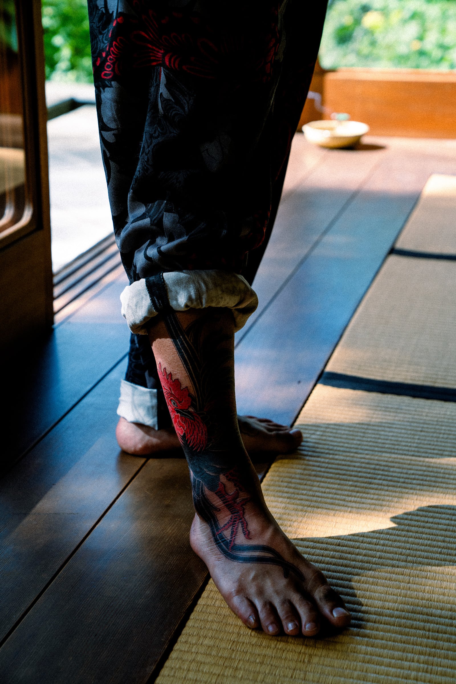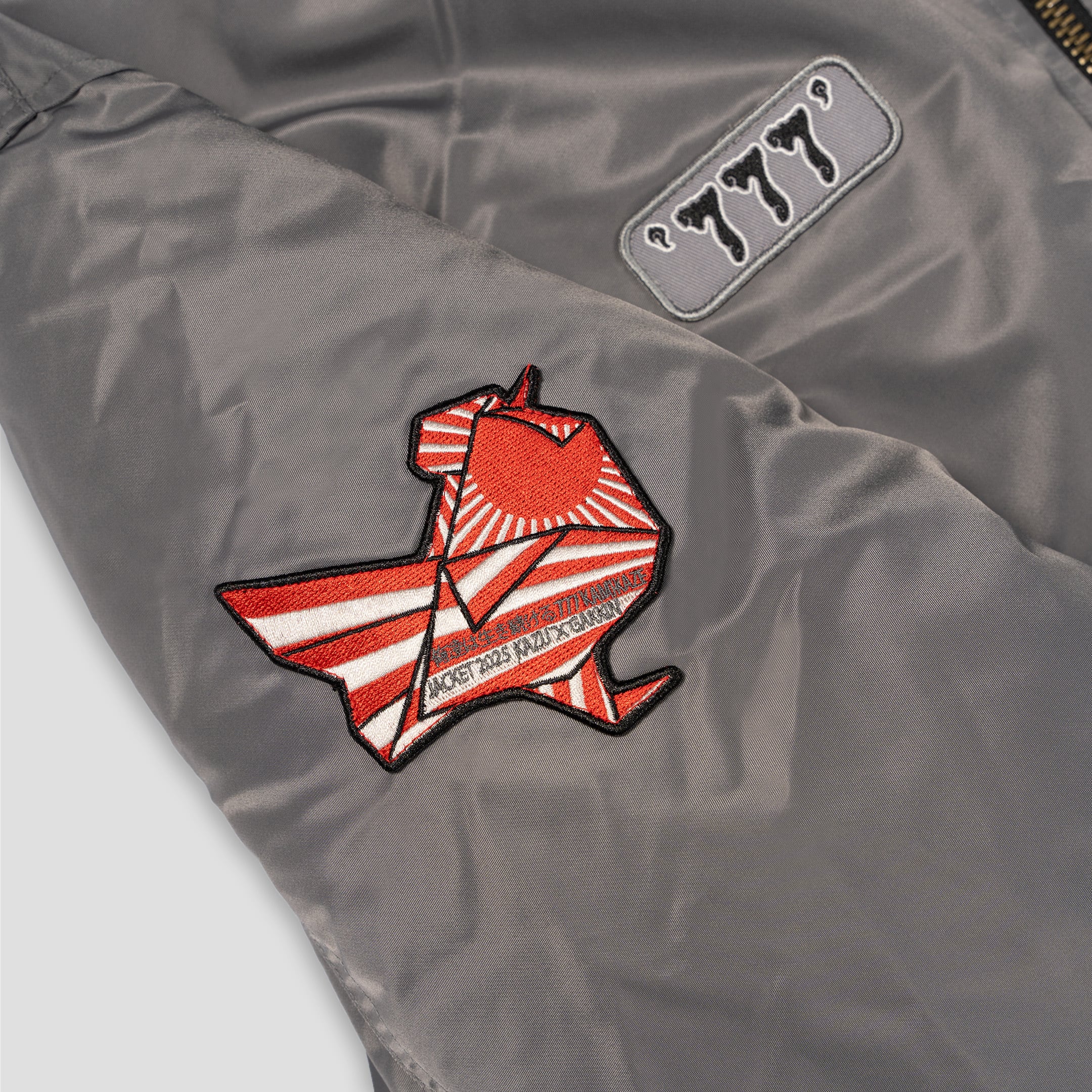 背面には尾長鶏の刺繍がダイナミックに施され、裏地には鶏脚紋のオリジナル生地を使用し、リバーシブルで着用可能。フロント右胸の"777”、左胸の“Gakkin”、袖のワッペンが物語性を統一。